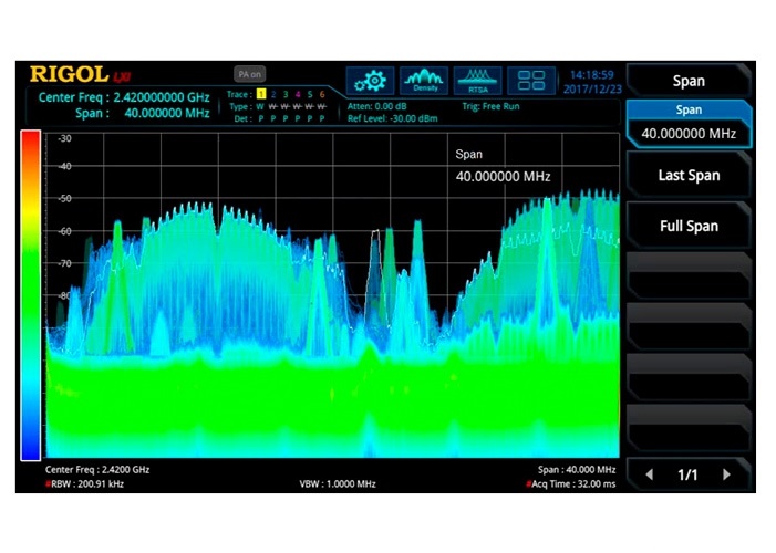 Опция RSA3000-B40 позволяет увеличить полосу анализа у анализаторов спектра Rigol серии RSA3000 (RSA3030 и RSA3045) в режиме RTSA до 40 МГц. Минимальная длительность для гарантированного захвата сигналов 100% POI - 7,45 мкс. Разрешение (для окна Kaiser) от 100 кГц до 3,21 МГц. Активируется программным кодом.
